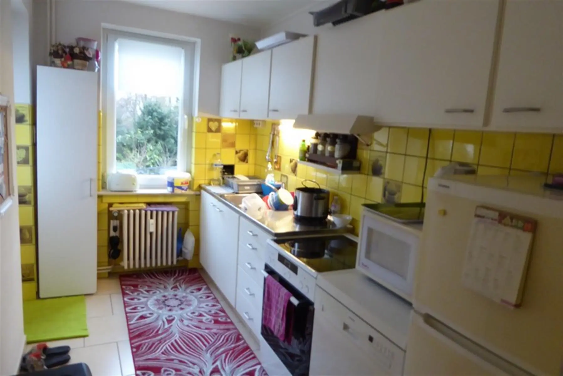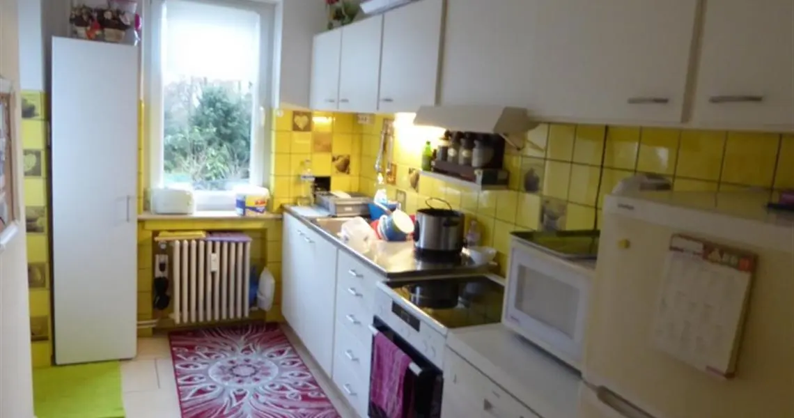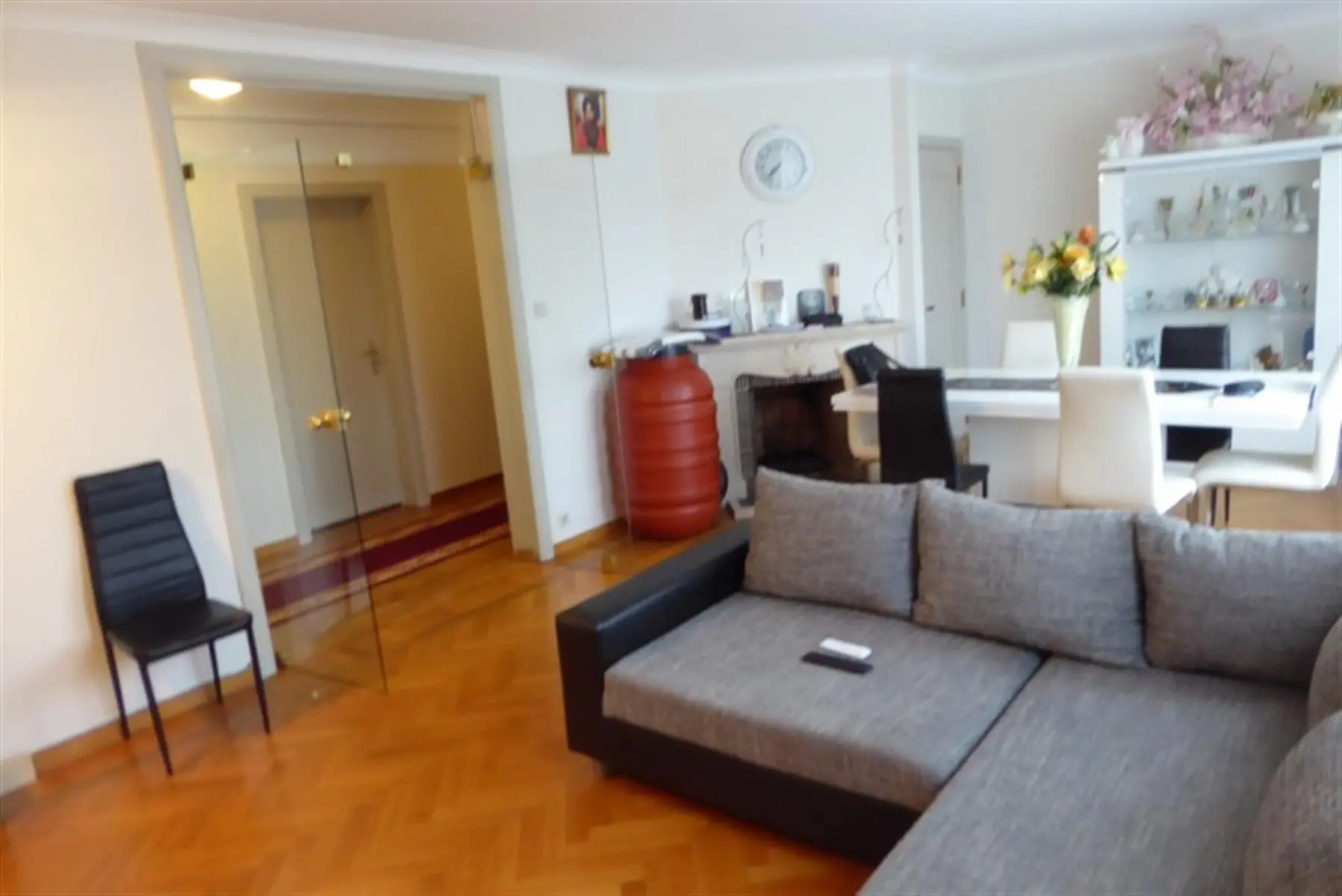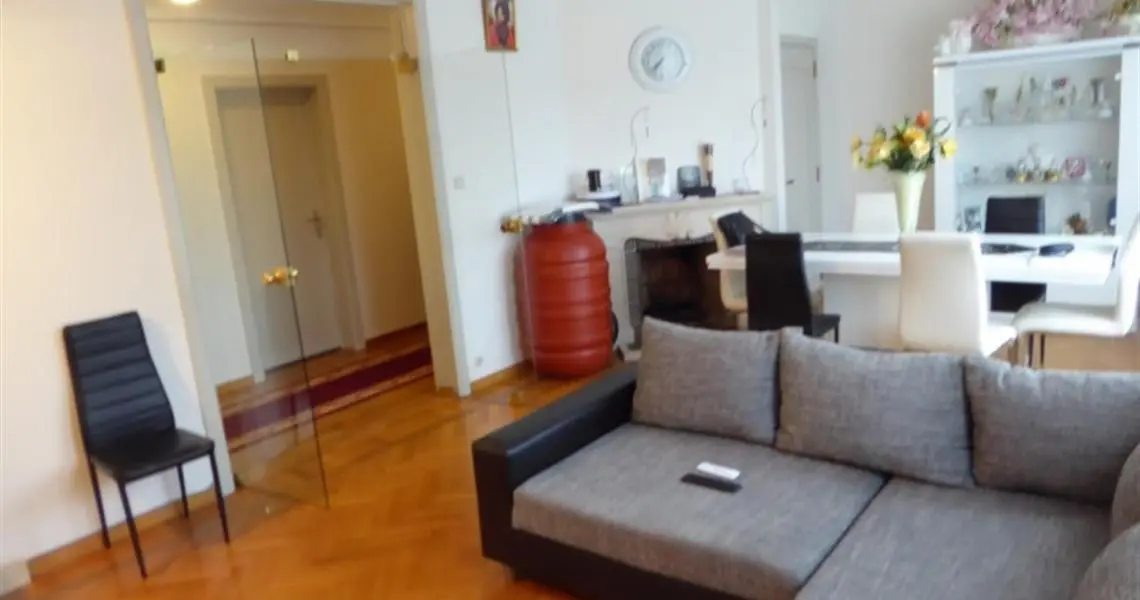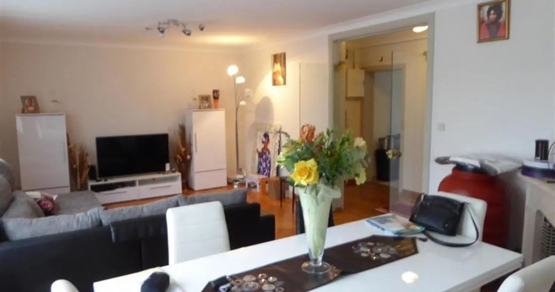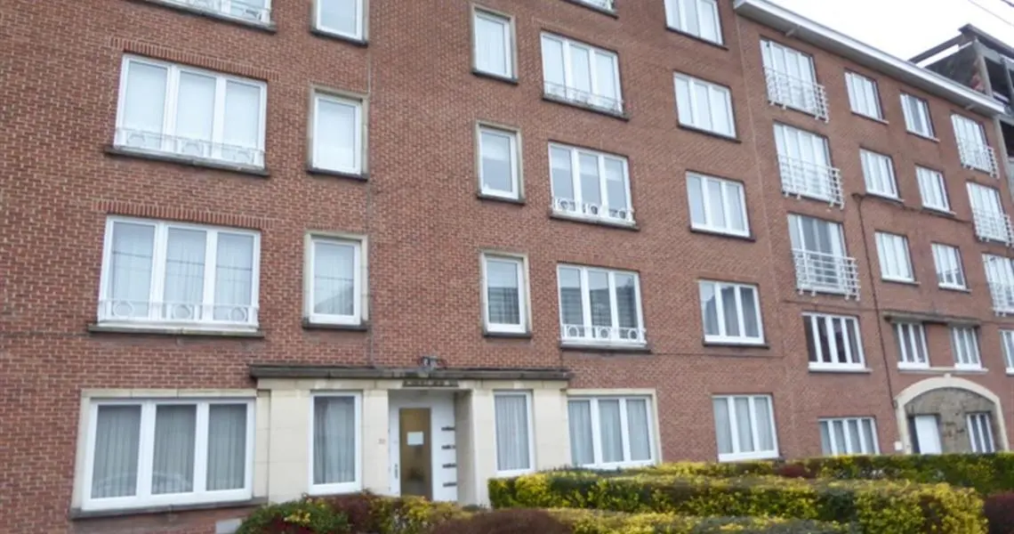 COMPROMIS SIGNE ! Au 1er étage droit: +/- 98 m² -Grand hall d'entrée parqueté avec grand vestiaire -Living parqueté de 4 m x 7 m avec cheminée feu ouvert et placards -Cuisine meublée et équipée : évier, plaque vitrocéramique, four, hotte, lave-vaisselle, frigo-congélateur -Petite terrasse arrière avec débarras -Salle de bains équipée: lavabo, douche italienne, wc, emplacement lessiveuse et armoire -Deux chambres dont une grande de 20 m² Sous-sols: -Une cave -Un garage Equipement: Eau, gaz, électricité, égouts, parlophone, ouvre porte, chauffage central au gaz avec calorimètres, production d'eau chaude par bulex gaz, châssis double vitrage, tel et tvd, ascenseur mis en conformité en 2012 et nouvelle toiture isolée en 2015, électricité conforme Loué à bail d'un an au 1er juin 2019 au loyer de 690 Euros par mois + Provision de 150 Euros (eau chaude, charges communes et chauffage Charges propriétaires : 200 Euros Superficie : +/- 98 m² Revenu cadastral : 1.285 Euros