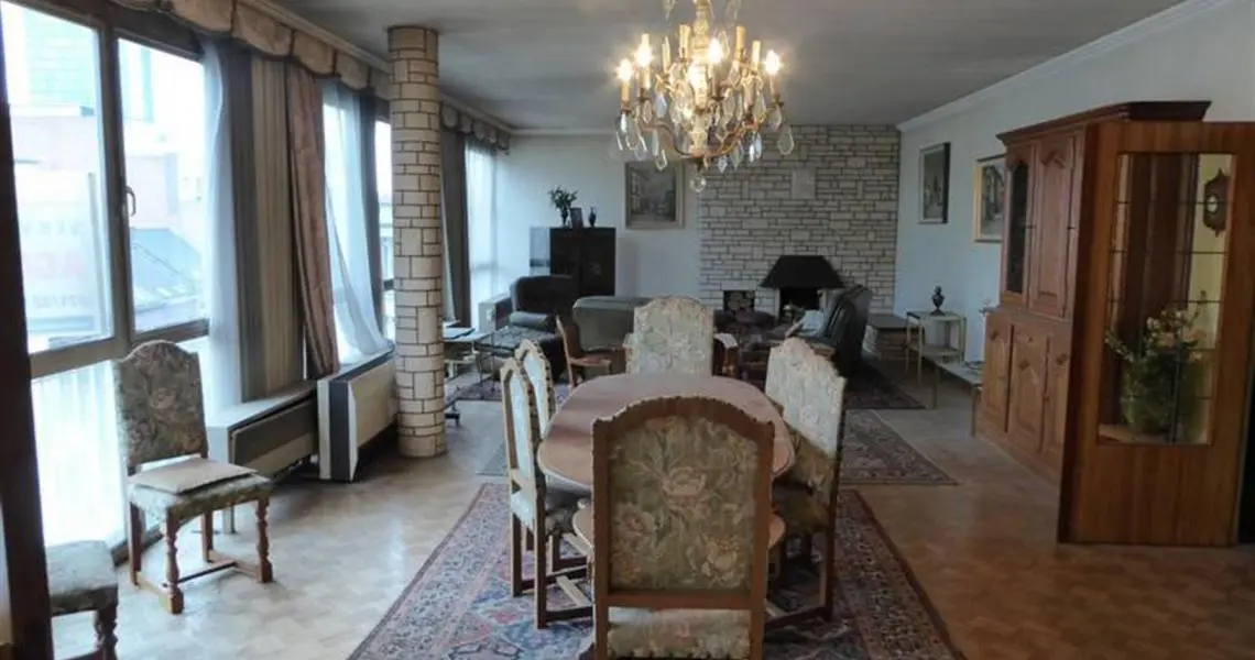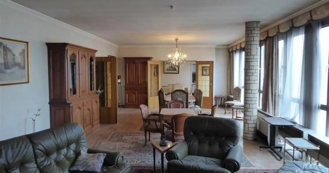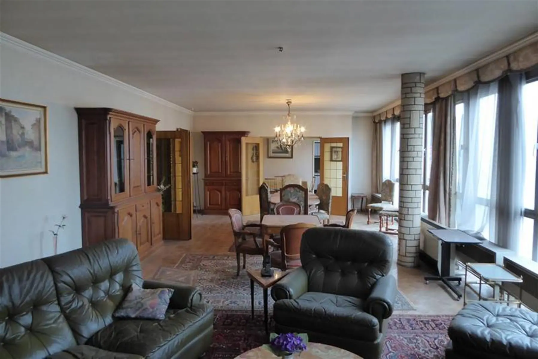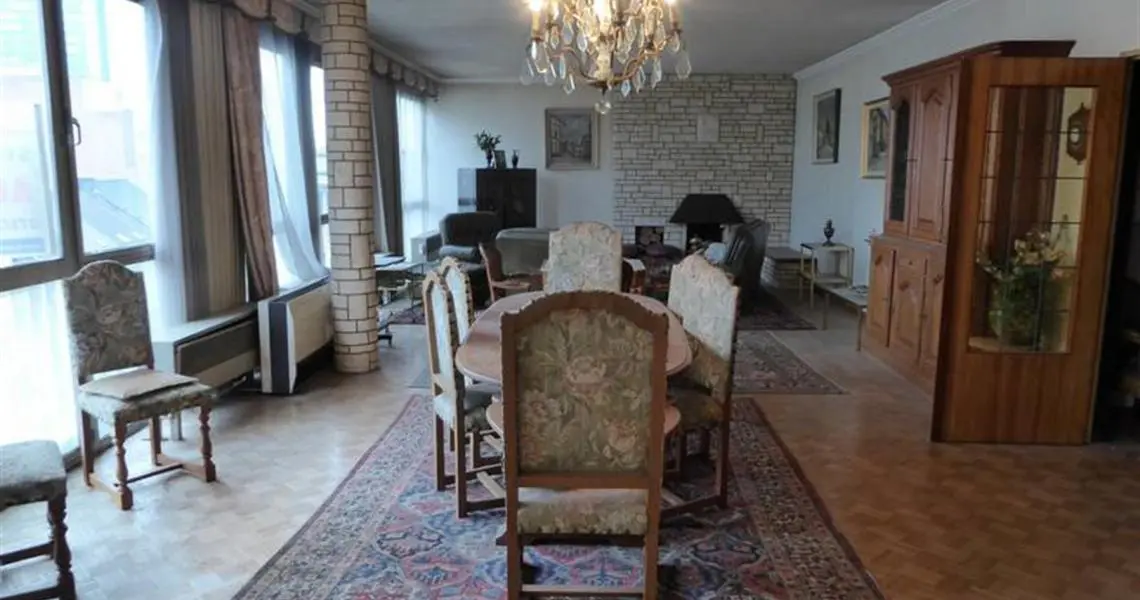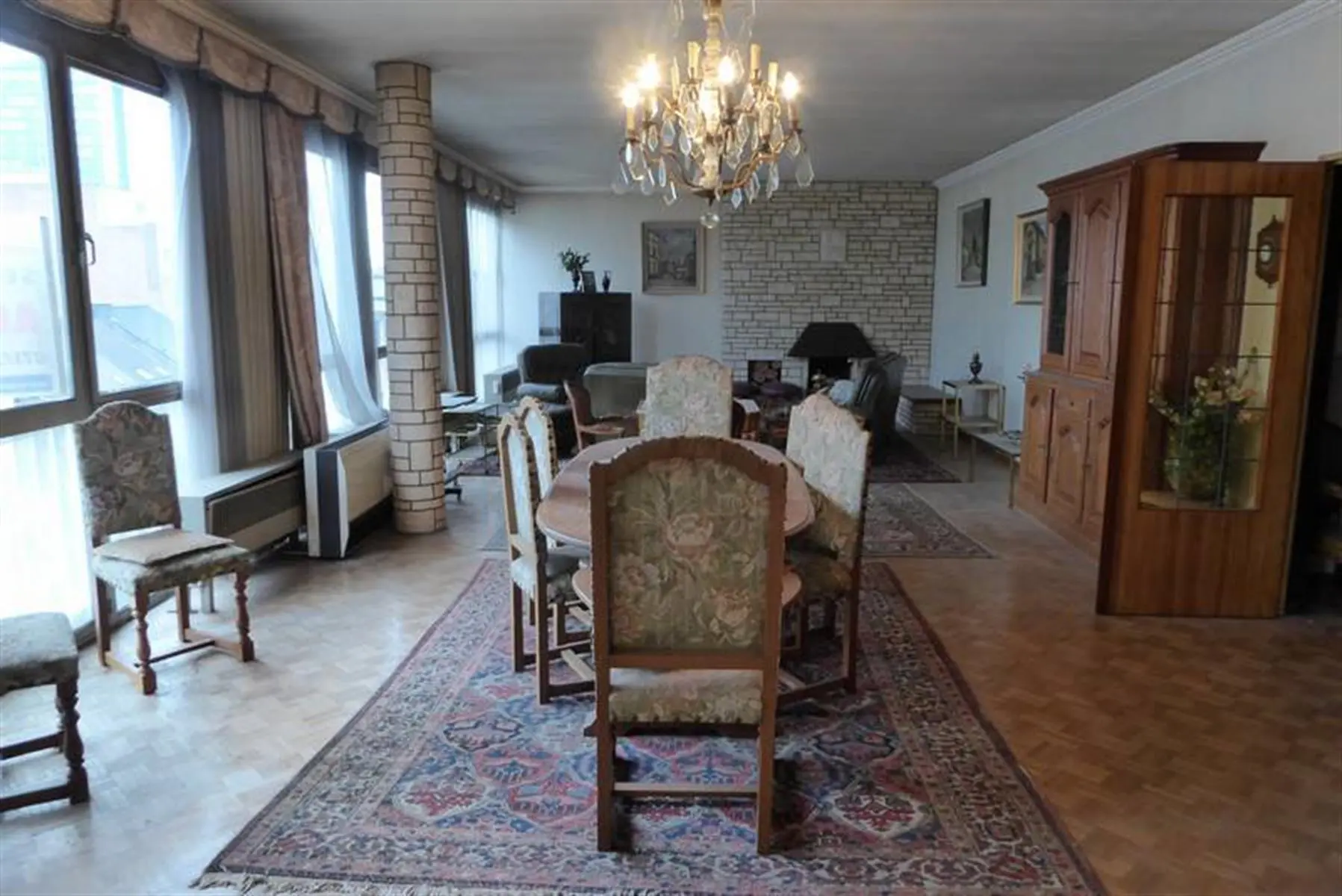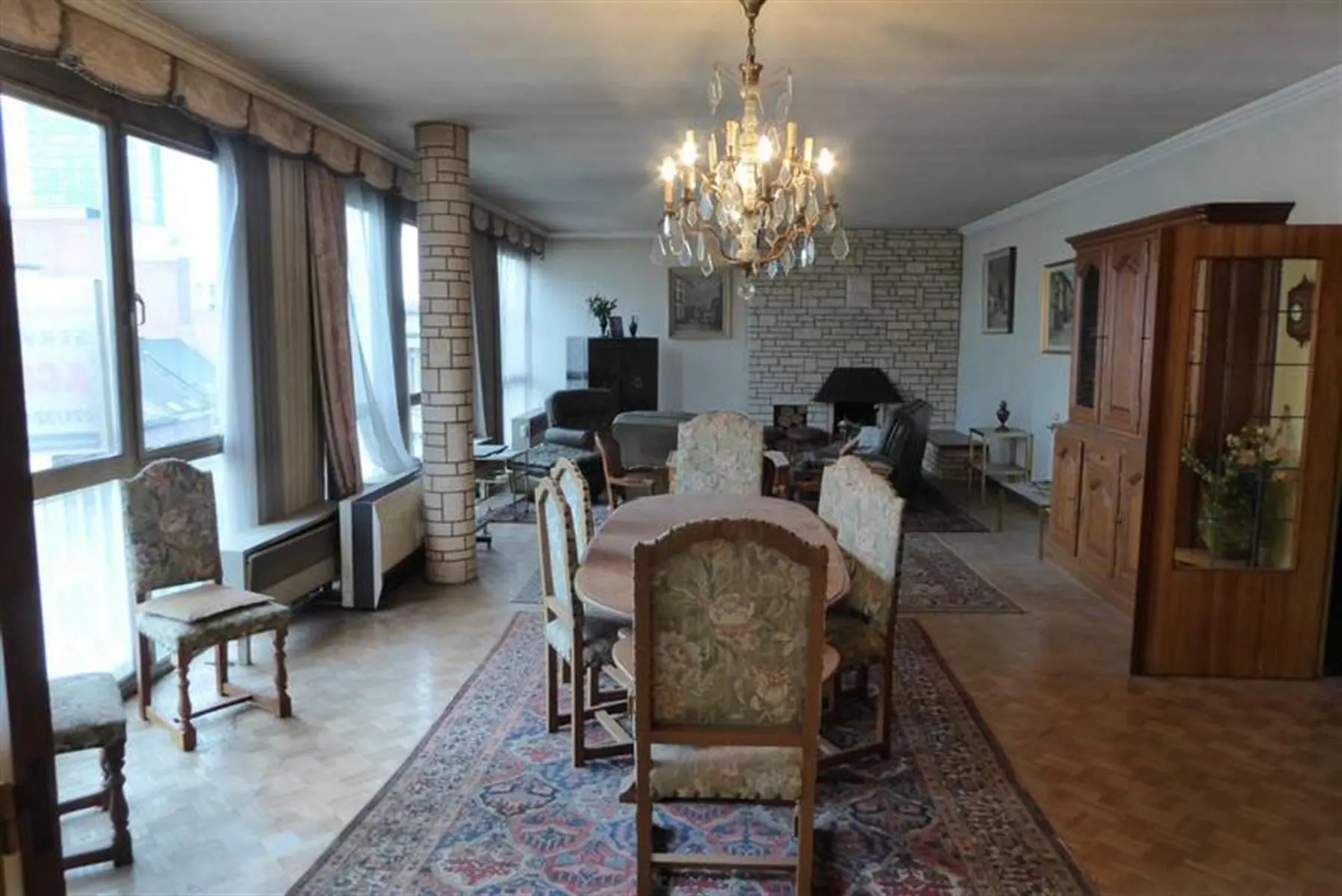 Spacieux appartement 4 chambres au centre ville, d'une superficie d'environ 210 m²:Au 6ème étage :- Hall d'entrée- Séjour d'environ 15 m²- Cuisine meublée semi équipée : évier, cuisinière, hotte, frigo congélateur- Débarras avec point d'eau- Spacieux living d'environ 45 m²- wc séparé- 3 belles chambres avec balcon (à l'arrière)- Deux salles de bains équipées : lavabo, baignoire, bidet- 1 grande chambre avec balcon (à l'arrière)- 1 dressing- Buanderie avec évier et emplacement lessiveuseSous-sols: une caveÉquipement:Eau, électricité, égouts, tel et tvd, chauffage central général au mazout avec calorimètres, châssis double vitrage, parlophone, ouvre porte, ascenseurLIBRE