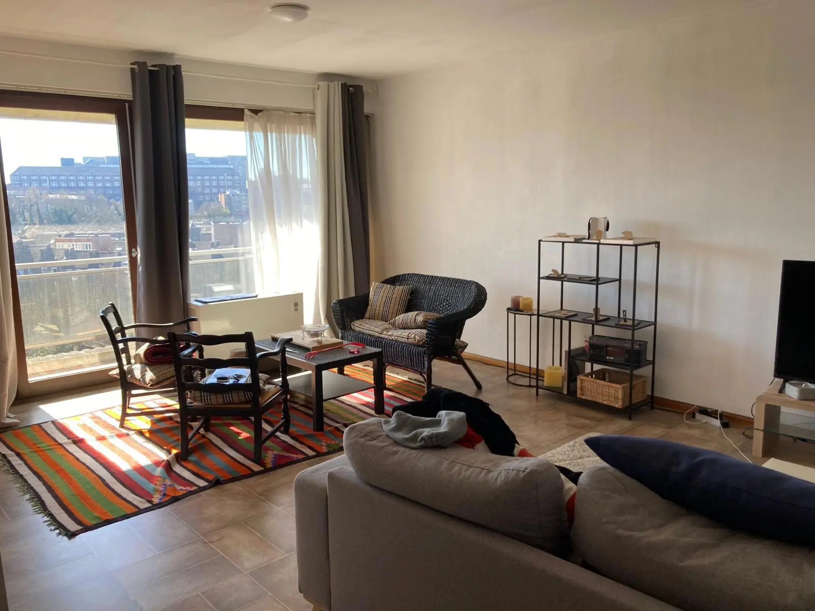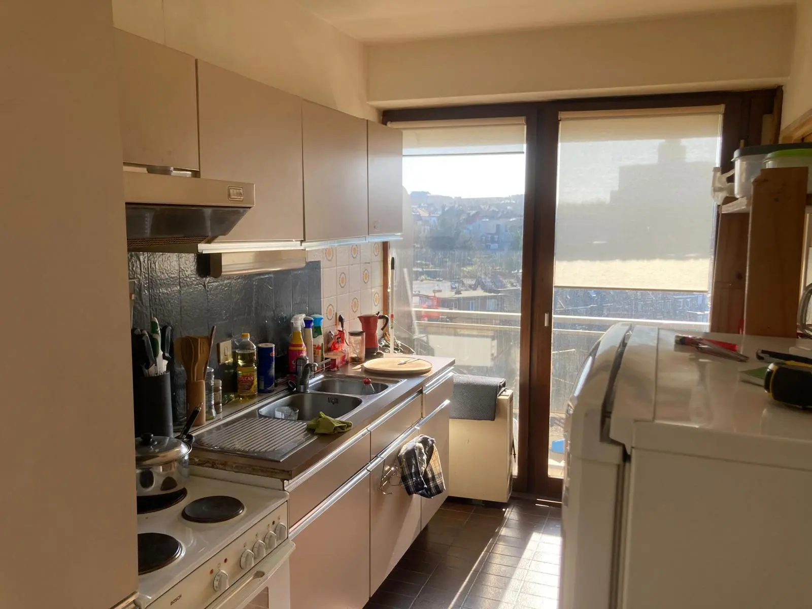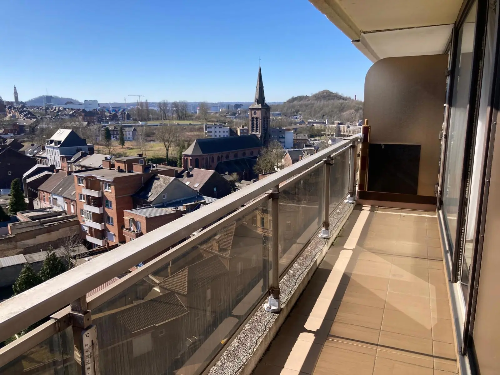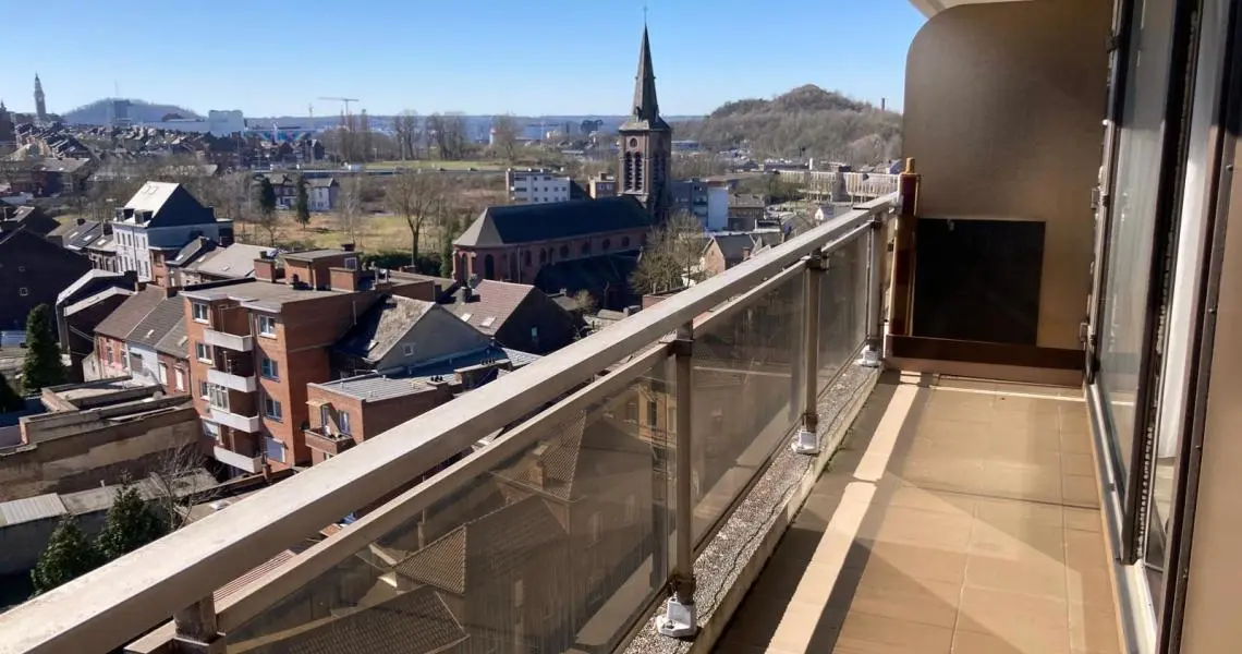 Proche de toutes communications, lumineux appartement 2 chambres et cave avec deux grandes terrasses 8ème offrant de jolies vues. Hall d'entrée, cuisine meublée et semi équipée sur grande terrasse, living (38 m2) avec porte fenêtre sur grande terrasse, wc, salle de bains avec baignoire/douche, deux chambres avec portes fenêtres sur grand balcon arrière. RC de base: 880 euros. Provision mensuelle charges: 155 euros. Gds travaux copropriété: néant. Electricité en conformité Libre d'occupation 09/2025. visites sur rendez-vous préalable.